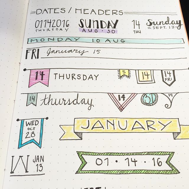 A great way to keep track of time with your journal is by using day and date banners. You could use the same banner design for a week and create a theme, or let your creativity run wild each day! Below are some of my favourite examples.