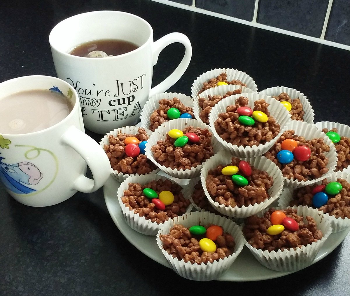 - Press either your finger or the back of a teaspoon in the centre of each nest, placing three Mini Eggs (or sweets of choice) on top.