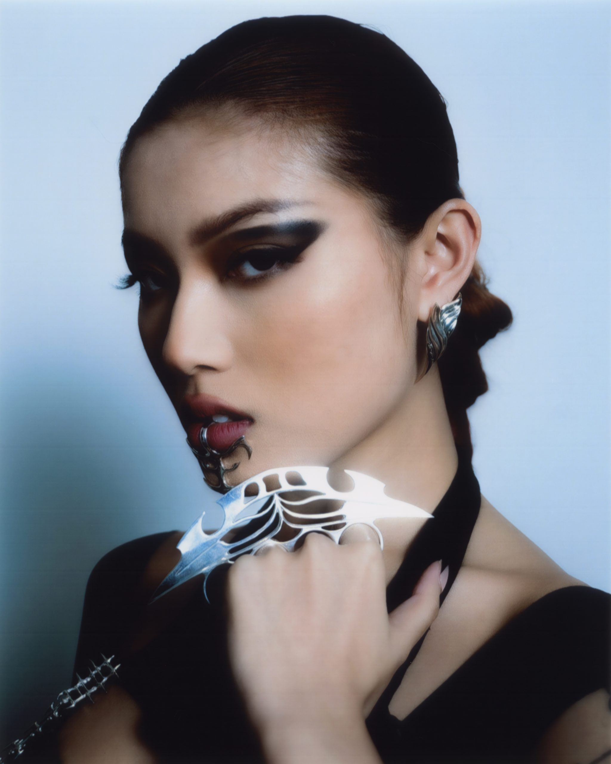 The collection includes items like ear studs, rings and knuckle dusters with spiky elements which acknowledge that memories can scar. By weaving in harsh elements of armour and blades, the jewellery doubles as a “self-protection essential”—an ode to the violence and enduring trauma women, especially trans women, face. “It’s a research into our preference to never lose fragility, even when fighting.”